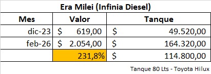 El aumento acumulado de la serie del Gosoil es del 231,8%, llenar un tanque de una camioneta con un tanque de 80 litros paso de $ 49.520 a $ 164.320, esto representa un incremento nominal de $ 114.800.