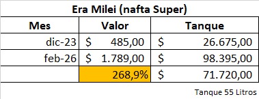 El aumento acumulado de la serie de la nafta común es del 268,9%, llenar un tanque de nafta de un auto con un tanque de 55 litros paso de $ 26.675 a $ 98.395, esto representa un incremento nominal de $ 71.720.