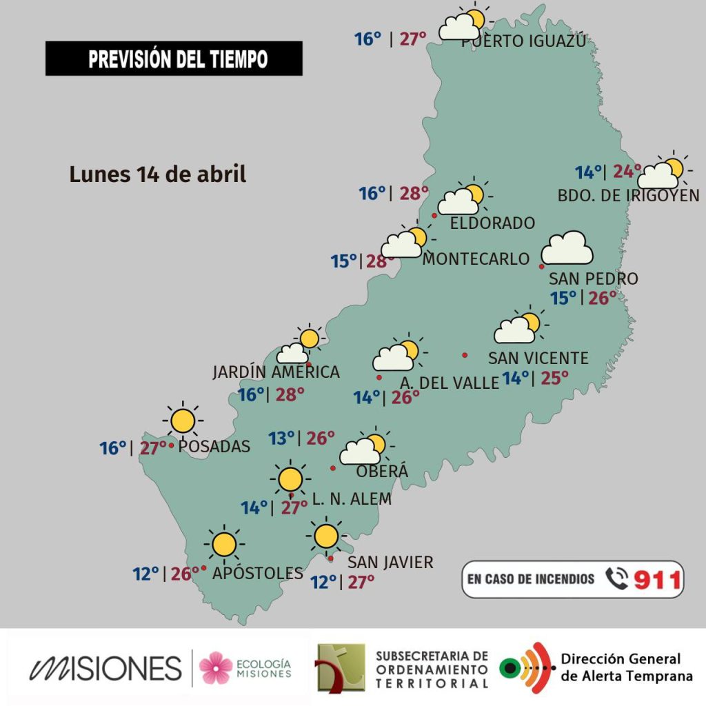 Las temperaturas se mantendrán dentro de los valores típicos de la época: templadas por la mañana y cálidas por la tarde. Se espera una máxima de 30 °C en Eldorado, con sensación térmica de hasta 33 °C, mientras que la mínima más baja se registraría en San Javier, con 16 °C.