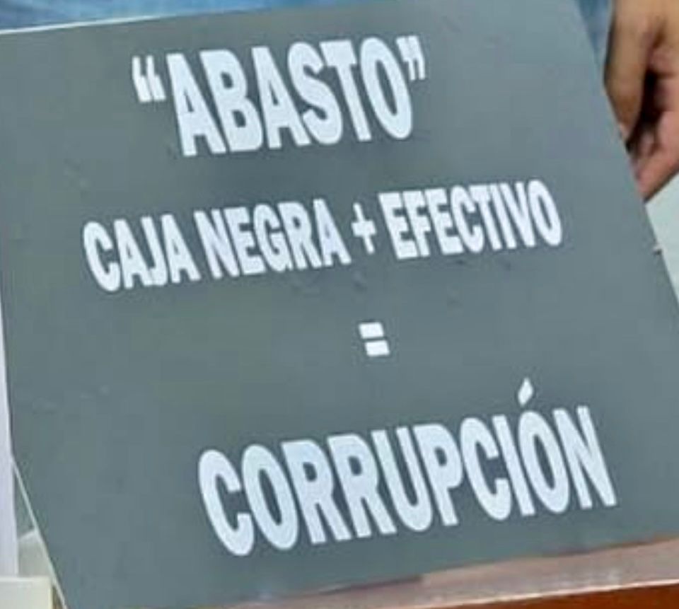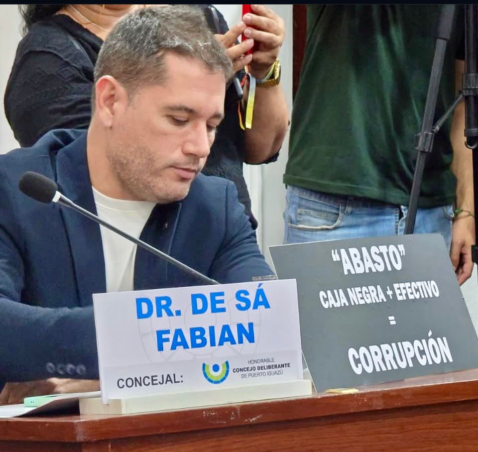 En este marco se dio una imagen que generó debate: el concejal opositor Fabián de Sa mostró un cartel que decía “Cobro de la tasa de abasto: caja negra + efectivo = corrupción”.