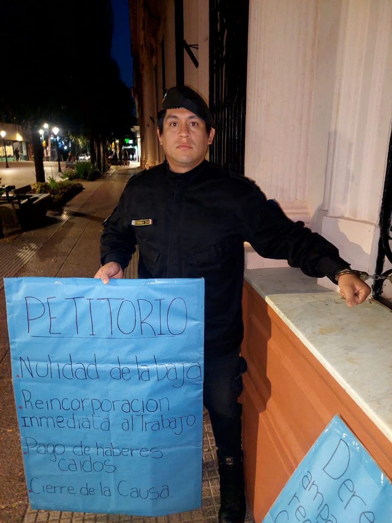 Dos ex efectivos de la Policía de Misiones se encadenaron este lunes frente a la Casa de Gobierno en Posadas, en una protesta pacífica con la que exigen su reincorporación a la fuerza provincial.