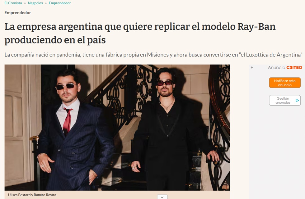 Con el título: “La empresa argentina que quiere replicar el modelo Ray-Ban produciendo en el país”, la nota publicada en la sección Negocios destaca el crecimiento de la empresa y su producción de anteojos de lujo en la planta que tiene el Parque Industrial de Posadas.