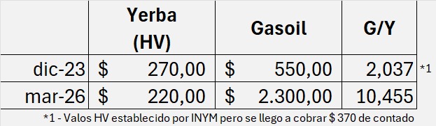 En diciembre de 2023, la relación entre gasoil y yerba era 2 a 1. Hoy supera 10 a 1. La yerba pasó de 270 a 220. El gasoil de 550 a 2.300.