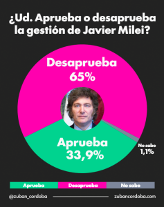 Según los datos más recientes, el 65% de los encuestados desaprueba la gestión presidencial, frente a un 33,9% que la aprueba, mientras que un 1,1% no sabe o no responde. La tendencia, además, muestra un crecimiento sostenido de la desaprobación desde fines de 2025.