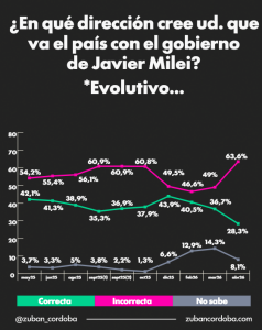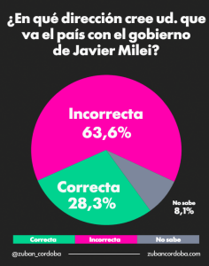 En relación a la dirección del país, el 63,6% considera que Argentina va en un rumbo “incorrecto”, mientras que solo el 28,3% cree que la dirección es “correcta”. Un 8,1% se mostró indeciso. La evolución de este indicador también evidencia un deterioro en los últimos meses, con un repunte reciente de las opiniones negativas.