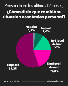En el plano económico personal, los resultados refuerzan este diagnóstico: el 55,2% de los encuestados afirmó que su situación empeoró en el último año, mientras que apenas un 7,6% indicó que mejoró. Por su parte, un 19,3% sostuvo que continúa “igual de mal” y un 16% “igual de bien”.