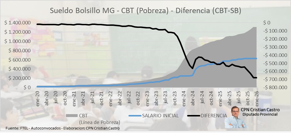 La diferencia entre salario y canasta básica se vuelve profundamente negativa, como muestra el gráfico de CBT – salario, ampliándose el monto necesario para no ser pobre.