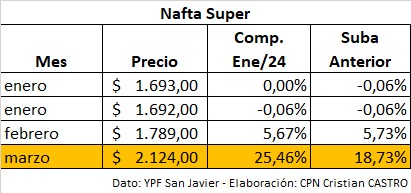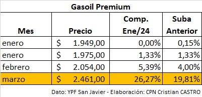 Un relevamiento de precios realizado en una estación de servicio de YPF en San Javier refleja un marcado incremento en los combustibles durante marzo de 2026, consolidando una tendencia alcista sostenida desde diciembre de 2023.