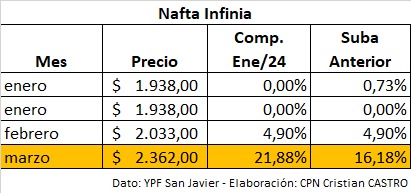 Por su parte, la nafta Infinia se ubicó en $2.362 por litro, con una suba del 16,18% en marzo y un acumulado anual del 21,88%. Si bien el incremento porcentual es menor que en la versión súper, su valor nominal ya supera ampliamente los $2.300.