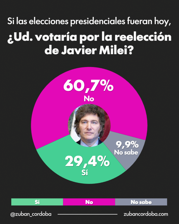 Los datos evidencian un deterioro en las condiciones de legitimidad electoral del oficialismo. Ante la consulta sobre una eventual reelección, sólo el 29,4% de los encuestados afirma que votaría por Milei, mientras que el 60,7% rechaza esa posibilidad y un 9,9% no tiene una posición definida.
