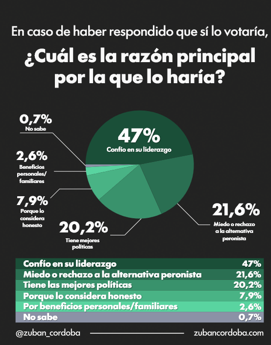 El núcleo de apoyo al mandatario se sostiene principalmente en la confianza en su liderazgo (47%), seguido por una dimensión reactiva vinculada al rechazo a la alternativa peronista (21,6%). En menor medida aparece la valoración de sus políticas (20,2%) y otros factores marginales como la percepción de honestidad (7,9%).