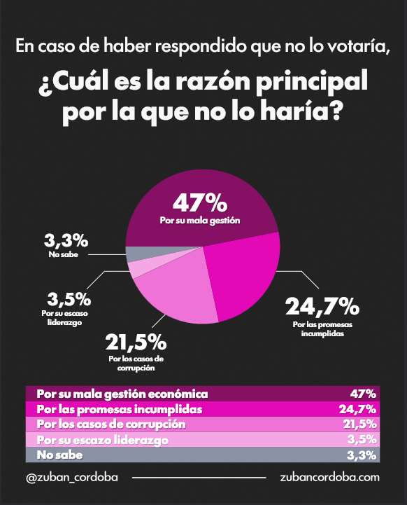 Incluso dentro del electorado original del presidente comienzan a observarse señales de desgaste. Un 33,9% reconoce haber reducido o retirado su apoyo, principalmente por la situación económica (47,7%), aunque también inciden factores vinculados a la credibilidad, como promesas incumplidas (18,9%) y percepciones de corrupción (12,7%).