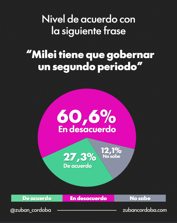 El clima de opinión también refuerza esta tendencia: un 60,6% de los consultados se manifiesta en desacuerdo con la idea de que Milei deba gobernar un segundo período, frente a un 27,3% que apoya esa posibilidad. A esto se suman demandas de renovación política (62,4%) y de construcción de alternativas más moderadas (46,4%).