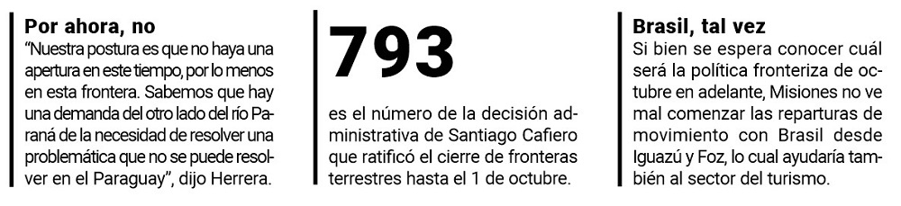 El Gobernador explicó, que la posición de la provincia es esperar a octubre para conocer cuál será la propuesta que la Nación tendrá sobre el movimiento terrestre de frontera. Reiteró que no es conveniente una reapertura del puente San Roque González entre Posadas y Encarnación (Paraguay). Sin embargo, dijo ver “con buenos ojos la apertura fronteriza con el Brasil, empezando con Puerto Iguazú y Foz do Iguaçu, ya que no pone en riesgo la utilización de camas críticas”.