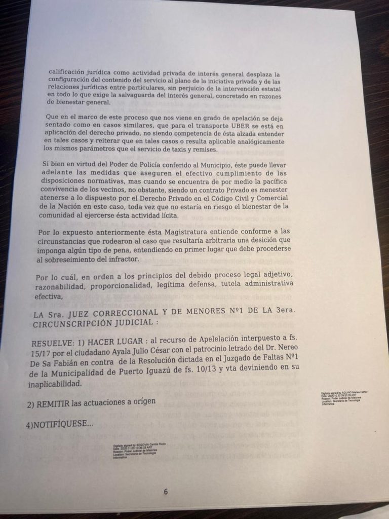 Puerto Iguazú : Resolución Judicial en favor de UBER