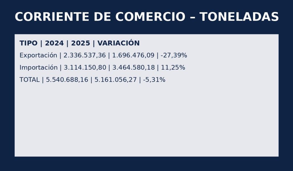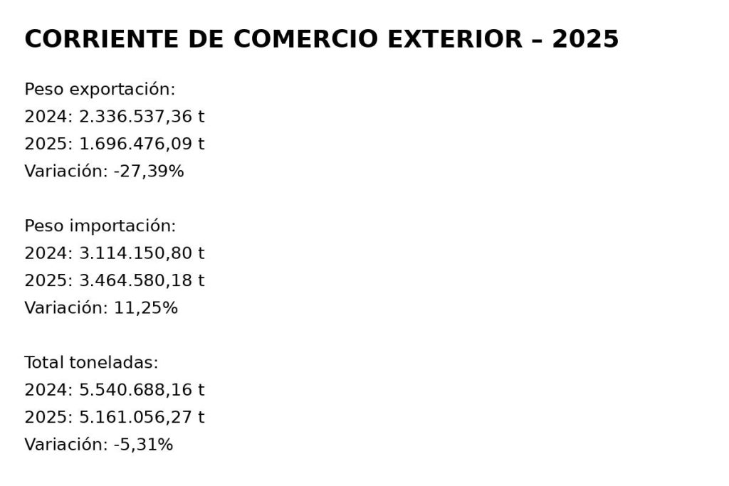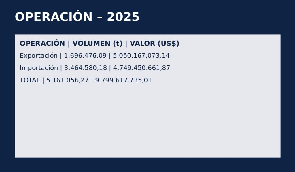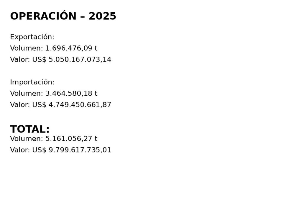 En 2025, el movimiento se dividió entre US$ 5,05 mil millones en exportaciones (1,69 millones de toneladas) y US$ 4,74 mil millones en importaciones (3,46 millones de toneladas). Aunque el volumen físico cayó 5,31%, el valor financiero creció 13,86%, indicando mayor participación de productos del alto valor agregado.